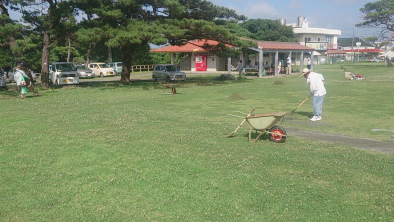 かりゆしシニアクラブの皆さんが多目的広場の草刈清掃をして下さいました